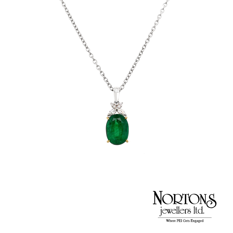 18 Karat White Pendant And Chain Set With A 2.43 Carat Genuine Oval Emerald, 2 Marquise Diamonds (.08 Carat) And 4 Round Diamonds (.02 Carat TW).