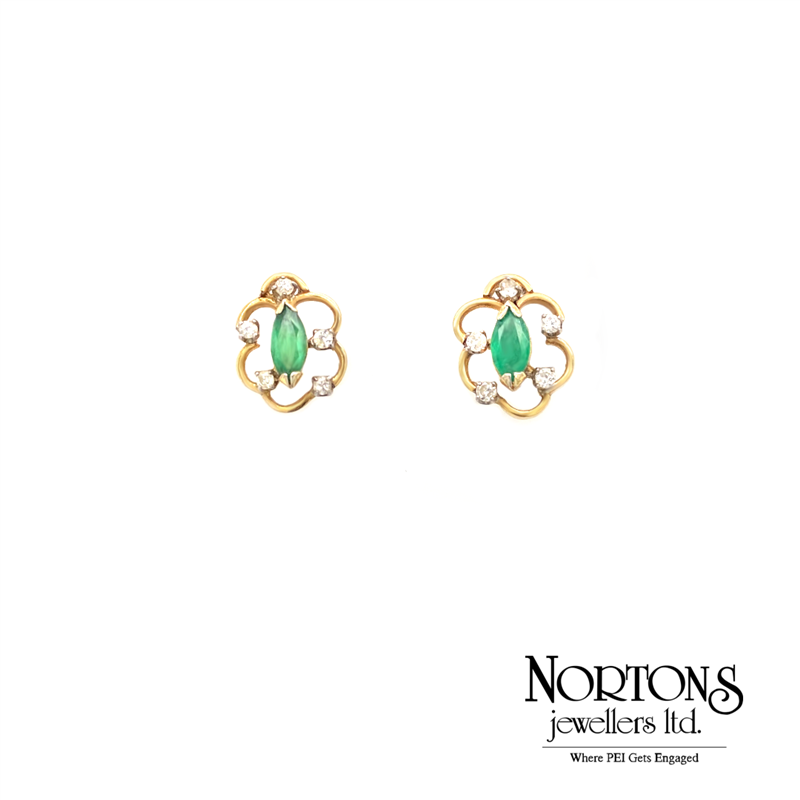A Pair Of 14 Karat Yellow Gold Earrings Set With 2 Marquise Emeralds And 5 Round Diamonds On Each Earring.