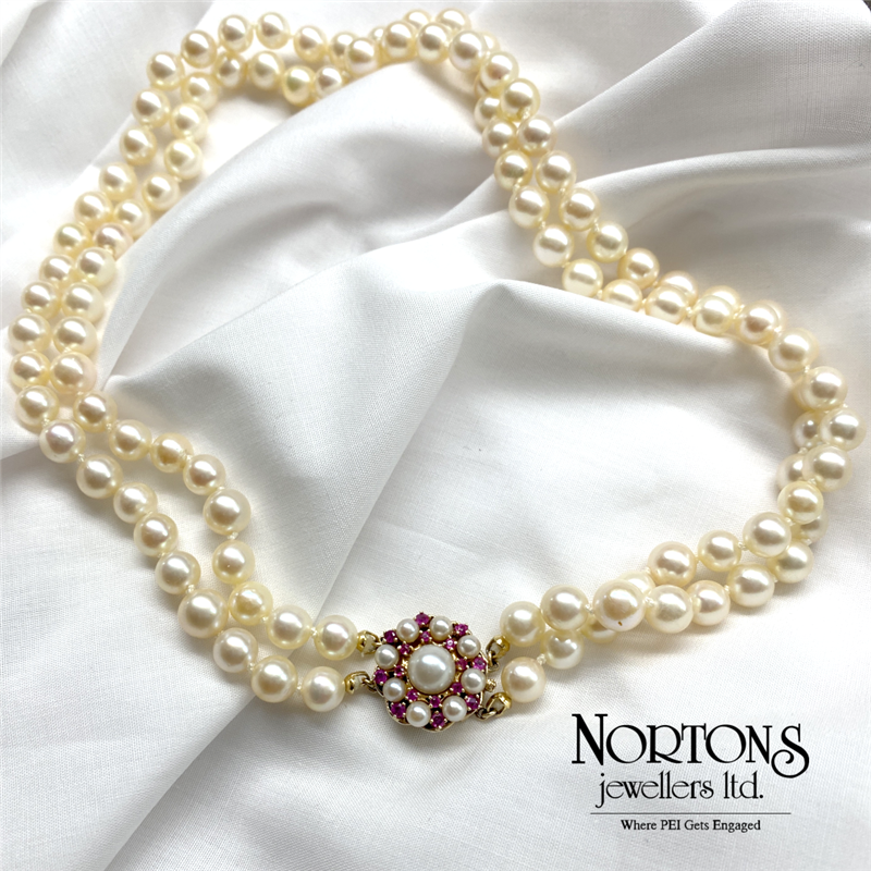 Double Strand Of 49 And 52 Cultured Pearls 7-7.5mm With A 14 Karat Yellow Gold Clasp Set With 1 7.5mm Cultured Pearl, 7 Cultured Pearls 3.5-4mm And 16 Rubies.