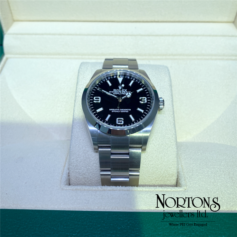 This 2024 pre-owned Rolex Explorer features the modern 36mm Oystersteel case and Rolex's Calibre 3230 automatic movement with a 70 hour power reserve. It's balanced size and legendary reliability make it one of the most versatile watches in the Rolex lineup.