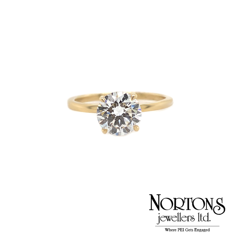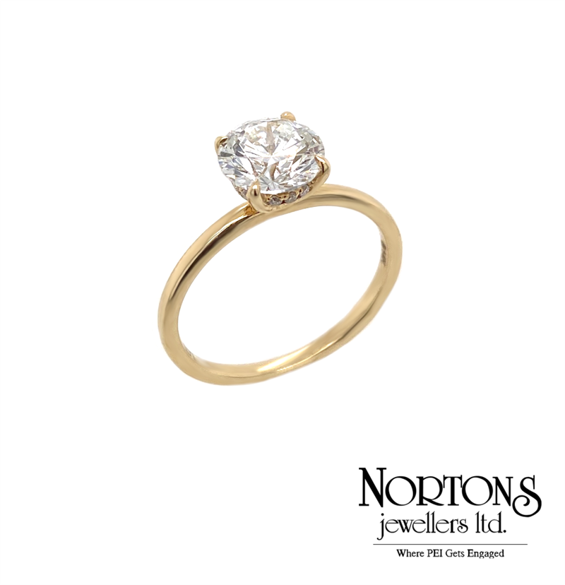 14 Karat Yellow Gold Diamond Ring. Set In 4 Claws Is A 1.55 Carat Hidden Halo Round Lab Grown Diamond (Vvs2 Clarity, F Colour). Ring Is Also Set With 12 Lab Grown Diamonds (.03 Carat TW, Vs Clarity, Ideal Cut).