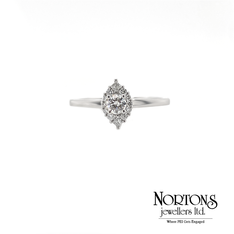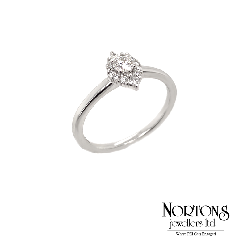 10 Karat White Gold Diamond Ring. Set In The Center Is A .182 Carat Canadian Diamond (I1 Clarity, F Colour). Surrounding The Diamond Are 12 Diamonds (0.128 Carat TW, I1-Si2 Clarity, G-I Colour).