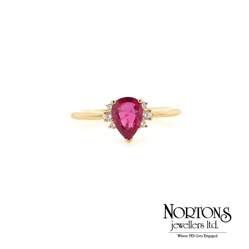 14 Karat Yellow Gold Ring Set With A .69 Carat Pear Shape Genuine Ruby And 6 Diamonds (.06 Carat TW).