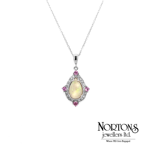 $1,995.00 $1,519.0010 Karat White Gold Pear Shaped Opal Necklace With Pink Sapphires and Diamonds